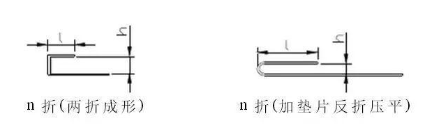 N折成形時(shí)依據(jù)l及h尺寸值而采取不同的加工方式,一種是直接分為兩折成型,另一種是加墊片反折壓平,一般情況下,N折中的H為較重要尺寸。