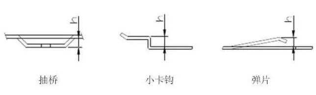 小斷差、小卡鉤、彈片、抽橋等采用折床普通模具無(wú)法完成或加工過(guò)程較為復(fù)雜,此時(shí)可設(shè)計(jì)折床易模來(lái)完成加工動(dòng)作。