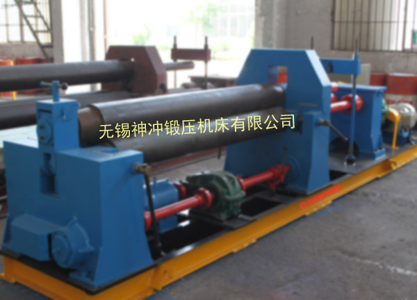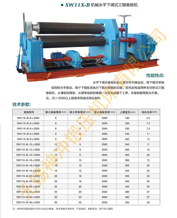 SW11X-B機(jī)械水平下調(diào)式三輥卷板機(jī)的上輥可作升降運(yùn)動,兩下輥可單獨(dú)或同時(shí)水平移動,每個(gè)下輥輪流執(zhí)行下輥與側(cè)輥的功能,即先后構(gòu)成兩種非對稱式三輥卷板機(jī),從薄板到厚板,從預(yù)彎端部到卷圓一次性完成整個(gè)工序,另卷制錐筒極為方便。