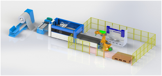 鈑金全自動橋架生產(chǎn)線是由開卷機(jī)、校平機(jī)、激光切割機(jī)、搬運碼垛機(jī)器人、全自動折彎機(jī)共同組成。開卷校平機(jī)主要用于2毫米以下的薄板,激光切割機(jī)用于割孔、裁切,機(jī)器人用于板材對折彎機(jī)的上下料及碼垛,自動折彎機(jī)用于連續(xù)折彎四刀,用于制作橋架的成型,尺寸調(diào)節(jié)方便。