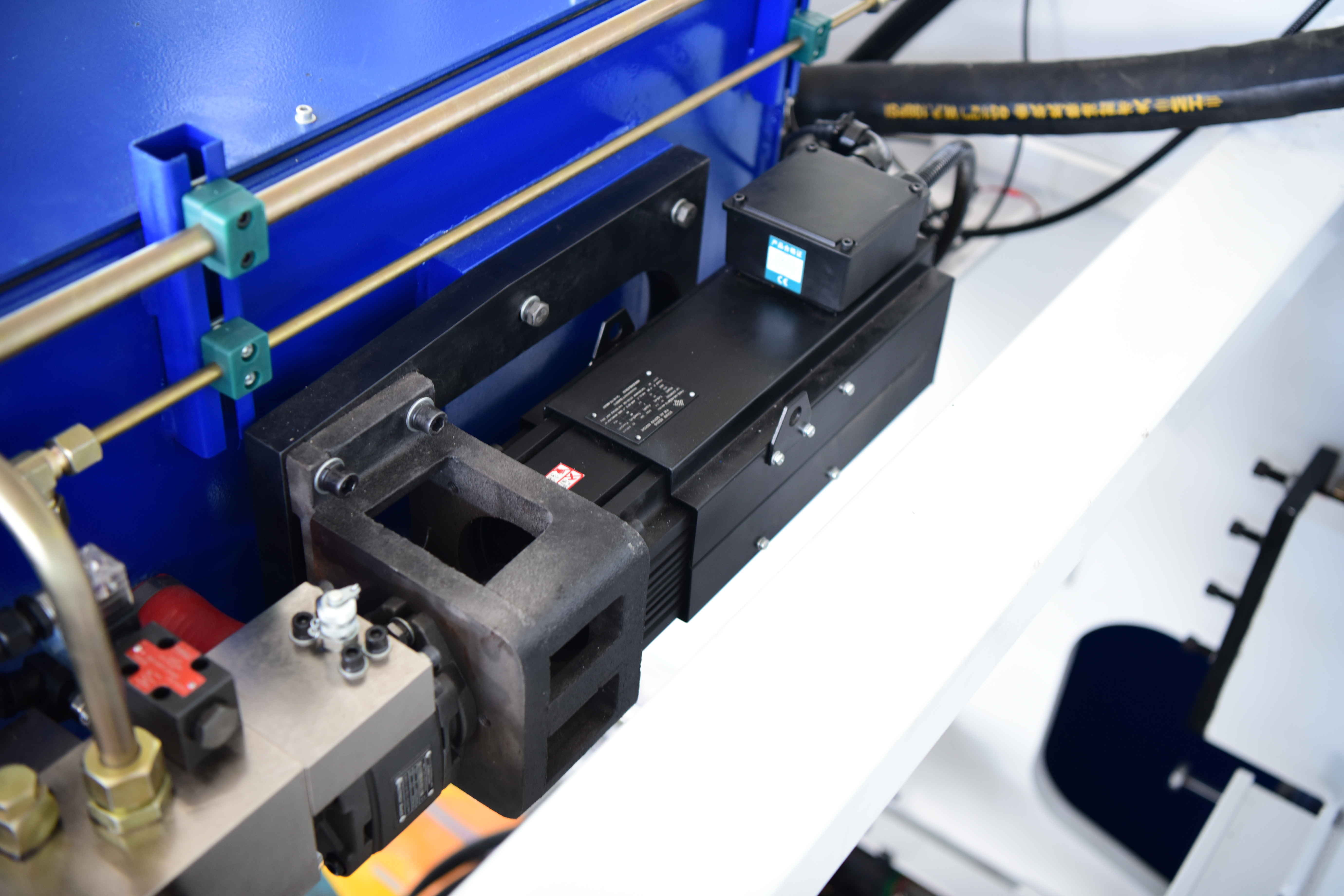 伺服閥一般會裝在油缸頂部。伺服閥輸出的流量主要由DNC和伺服放大器控制。這些輸出的流量主要在整個行程中控制滑塊速度。伺服電機運行變 快,折彎速度變慢,滑塊由下死點運動到上死點。